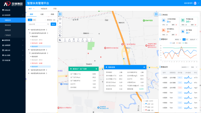 平台通过历史数据分析建立预测模型,实现设备异常、水质波动的分级预警,并支持一键生成多维度运行分析报告。可在设备完全失效前识别潜在故障,使维护人员能够提前介入处理,避免突发停机导致的供水中断,降低应急维修成本。