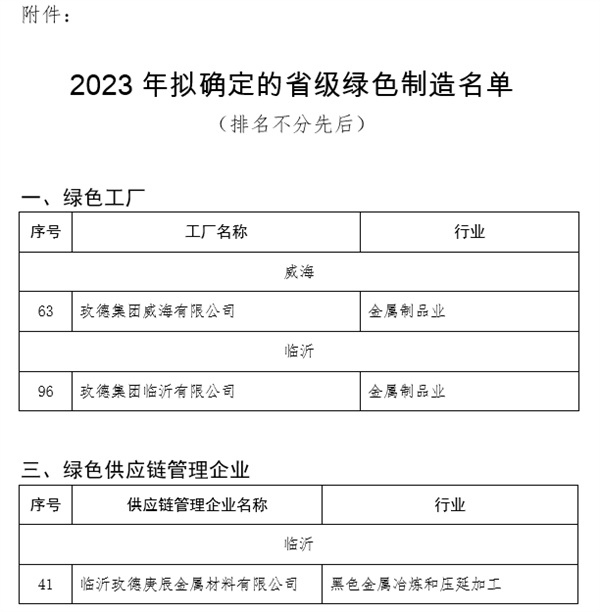 7月28日,山东省工业和信息化厅公布了2023年(第一批)省级绿色制造名单。玫德集团3家企业入选,其中玫德集团威海有限公司、玫德集团临沂有限公司被评为为山东省绿色工厂,临沂玫德庚辰金属材料有限公司被评为山东省绿色供应链管理企业。