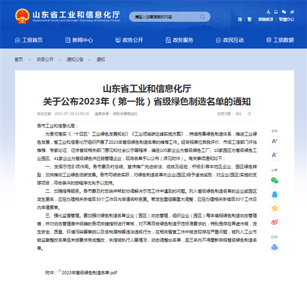 2023年山东省绿色制造名单入围情况: