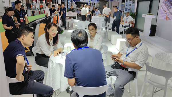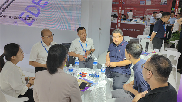 玫德集团董事局副主席李传军,济南科德智能科技有限公司总裁刘少云,玫德庚辰金属材料有限公司总裁张志义,济南科德智能科技有限公司高级副总裁张明一、刘璐在展会现场指导工作并与客户深入交流。