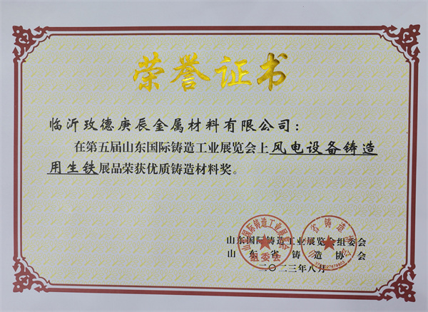 3. 临沂玫德庚辰金属材料有限公司展品“风电设备铸造用生铁”荣获“优质铸造材料奖”。