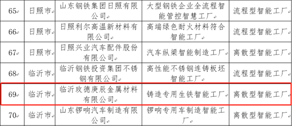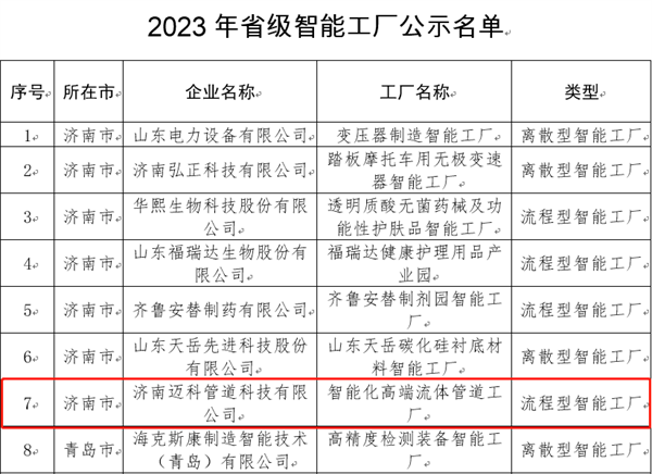 玫德集团临沂有限公司的高性能流体输送连接件智能工厂、济南迈科管道科技有限公司的智能化高端流体管道工厂、临沂玫德庚辰金属材料有限公司的铸造专用生铁智能工厂,入选2023年山东省智能工厂;玫德集团威海有限公司的“生产计划优化、资源动态组织智能场景”入选2023年山东省智能制造场景。本次智能工厂与智能制造场景的成功入选,不仅再次验证了公司智能制造技术水平的先进性,也为行业推进智能制造再添新示范样板。