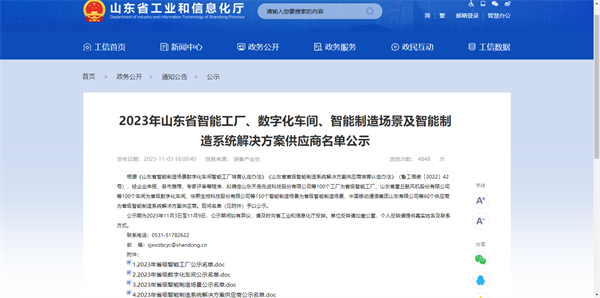 2023年11月3日山东省工业和信息化厅公示了《2023年山东省智能工厂、数字化车间、智能制造场景及智能制造系统解决方案供应商名单》。