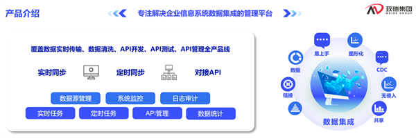 数据集成平台是一款覆盖数据实时传输、数据清洗、API开发、API测试、API管理全产品线,专注解决企业信息系统数据集成的管理平台。通过平台内实时同步、定时同步、对接API等功能,帮助客户解决数据和信息分散、多个业务系统数据差异性大、接口开发成本高、交换和共享困难等难题。在数据源方面,平台覆盖MySQL、SQL Server和Oracle90%主流数据库,同时支持HTTP和webservice接口数据的采集,100%覆盖主流应用层通信协议,为实现数据的整合提供了更多可能性。在数据处理方面,平台支持5个不同的数据处理组件,包括数据JOIN合并、数据去重合并、数据汇总计算等运算组件,以及字段名映射、字段值映射、数据清洗转换等数据转换组件,共11个组件可供选择,以满足对数据的各种处理需求。