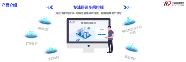 玫德铸造排程系统沉淀玫德集团60+年铸造最佳实践经验,融合精益生产理念;形成了应用场景广泛、自识别利用库存、排产细化防漏项、科学兼顾效率与库存、自动优化生产节拍、供应商送货计划联动、计划统一调度等具备玫德独有的铸造车间排程系统。