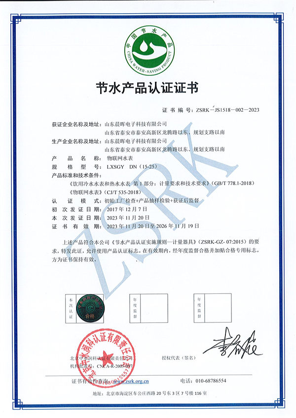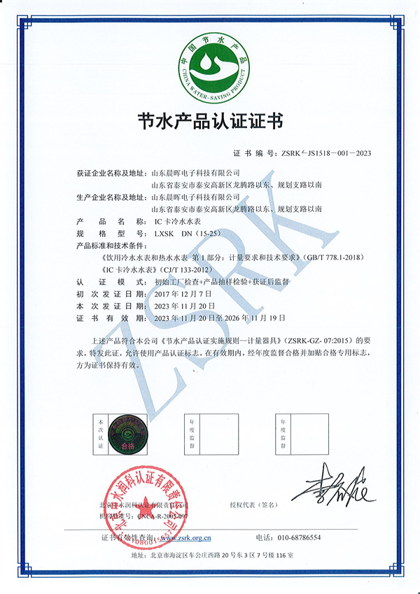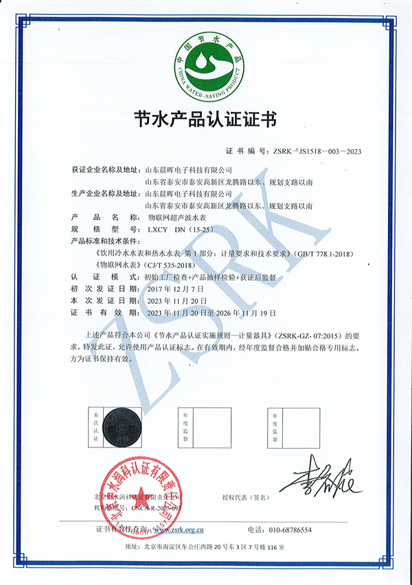 2023年10月,经过国家权威检测机构的严格审查,玫德集团旗下山东晨晖电子科技有限公司IC卡冷水水表、物联网水表、物联网超声波水表产品顺利通过节水认证的现场审核,并在本月获得节水产品认证证书。