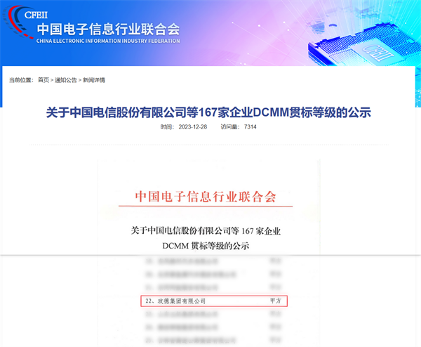 2023年12月28日,中国电子信息行业联合会发布了《关于中国电信股份有限公司等167家企业DCMM贯标等级的公示》,开云官方网站在线登陆成功通过了DCMM《数据管理能力成熟度评估模型》稳健级(3级)贯标认证。