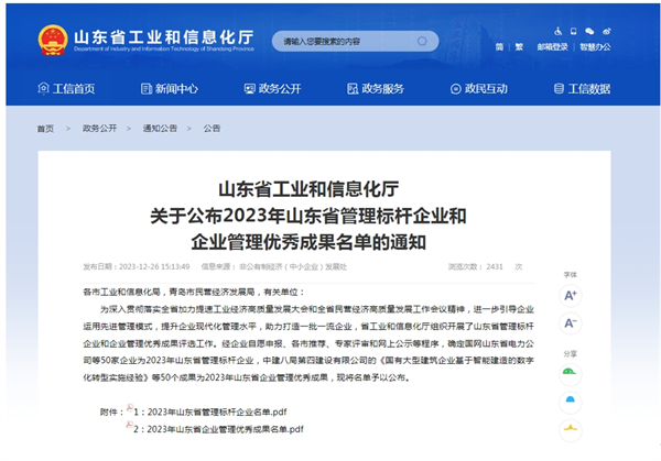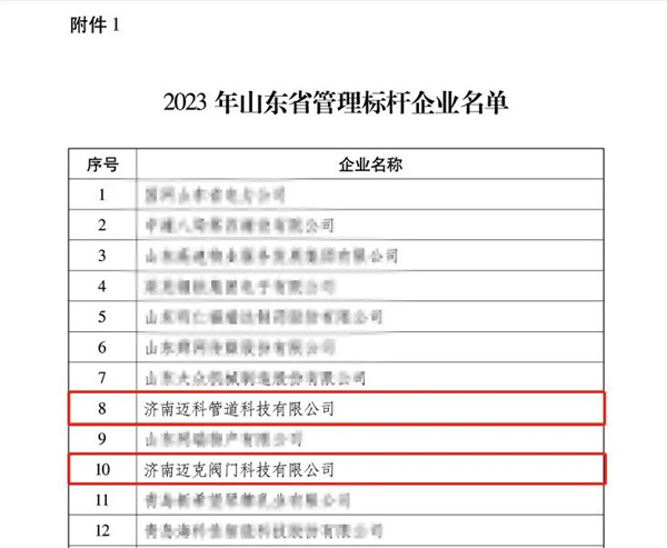 2023年12月25日山东省工业和信息化厅发布《关于公布2023年山东省管理标杆企业和企业管理优秀成果名单的通知》,公布玫德集团旗下济南迈科管道科技有限公司、济南迈克阀门科技有限公司均顺利通过2023年山东省管理标杆企业认定。