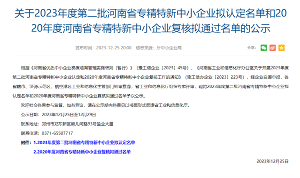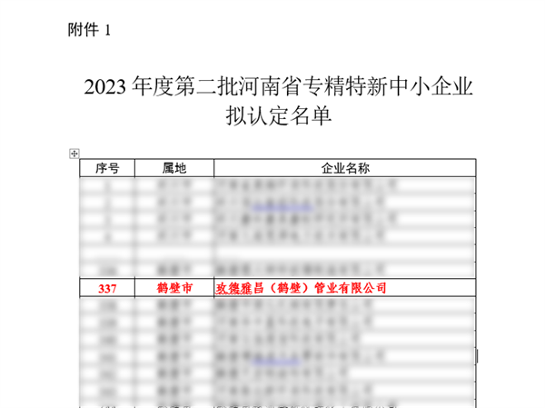 2023年12月25日,河南省工业和信息化厅发布《关于2023年度第二批河南省专精特新中小企业拟认定名单和2020年度河南省专精特新中小企业复核拟通过名单的公示》。经企业自主申报、严格审查、专家评选、审核复核等程序,玫德雅昌(鹤壁)管业有限公司顺利通过认定,成功入选河南省2023年专精特新中小企业。