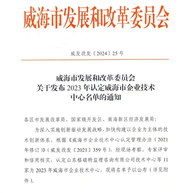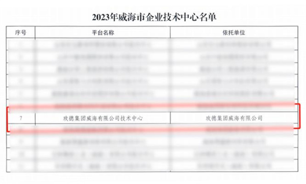 玫德集团威海有限公司深入实施创新驱动发展战略,经现场考察、专家评审和信用核实,获得威海市企业技术中心认定。