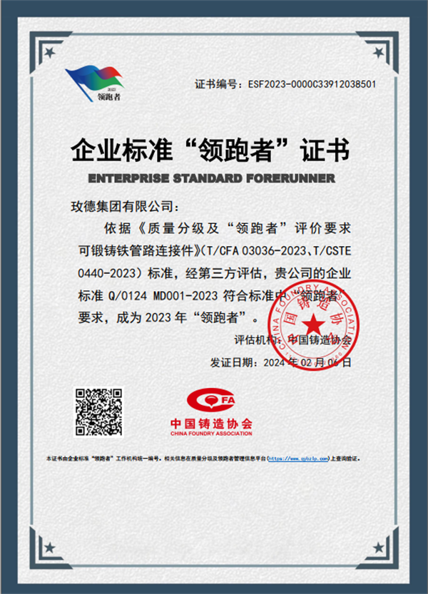 开云官方网站在线登陆入选“领跑者”的 Q/0124 MD -2023《可锻铸铁管路连接件》企业标准,整体技术水平高于国际标准和国家标准,达到国际先进水平。高水平标准引领,为行业高质量发展提供了切入点,强化了标准引领作用,促进了行业全面质量提升。