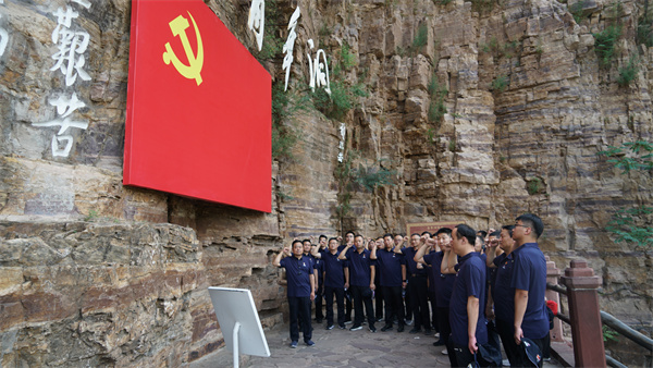 在红旗渠青年洞前,面对庄严的党旗,在党委郭书记的带领下,重温入党誓词。