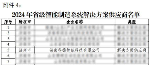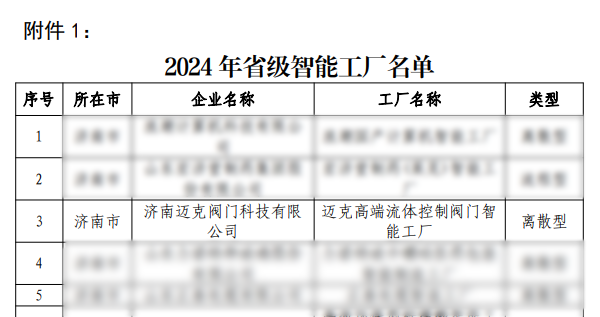 2024年8月27日,山东省工业和信息化厅发布《关于公布2024年山东省级智能工厂、数字化车间、智能制造场景和系统解决方案供应商名单的通知》,经企业申报、地市推荐、专家评审、网站公示等程序,济南迈克阀门科技有限公司的迈克高端流体控制阀门智能工厂荣获“山东省智能工厂”称号,济南科德智能科技有限公司荣获“山东省智能制造系统解决方案供应商”称号。